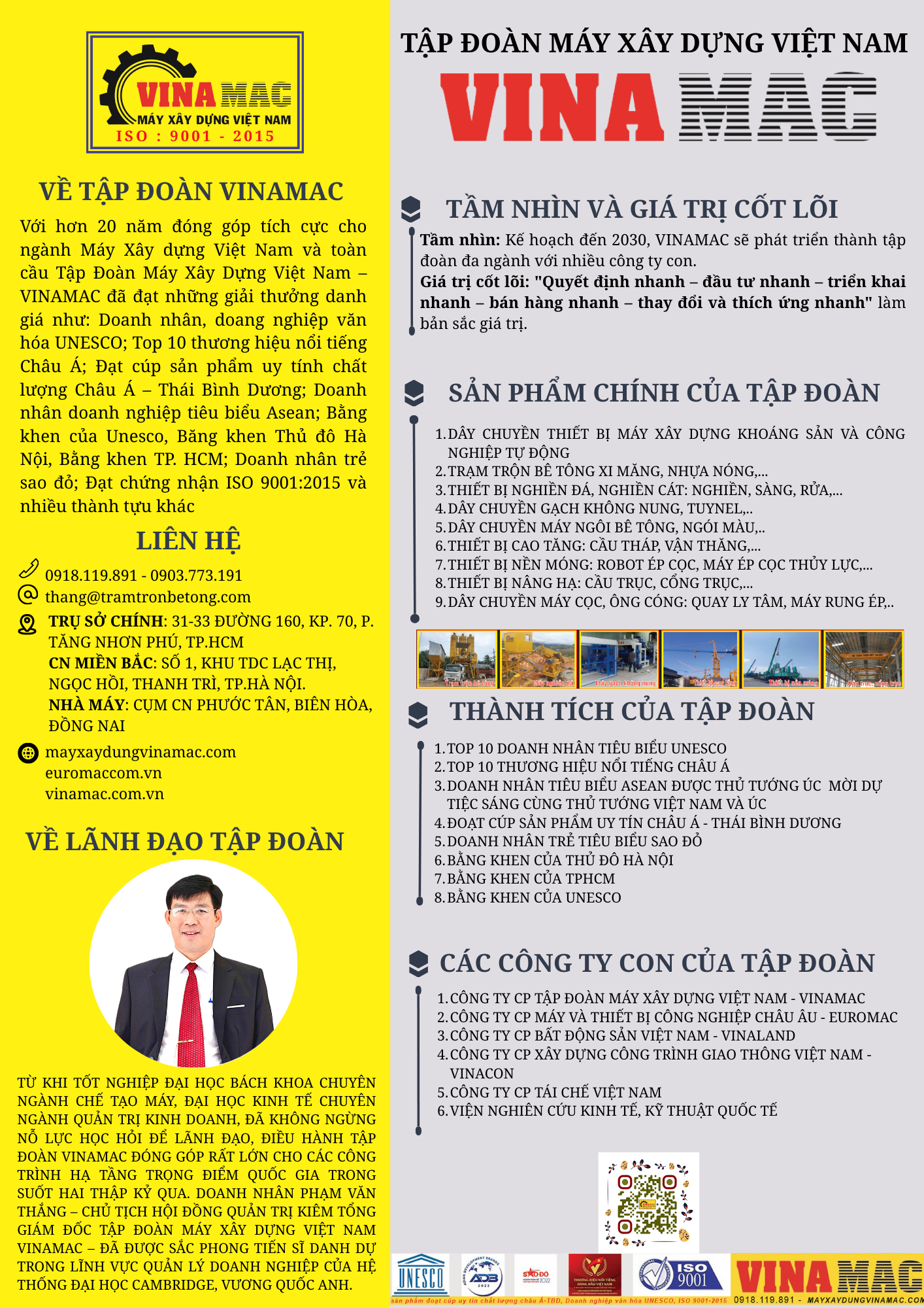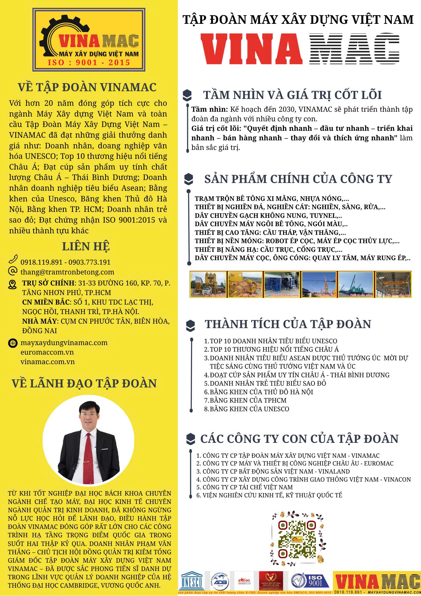 Với hơn 20 năm đóng góp tích cực cho ngành Máy Xây dựng Việt Nam và toàn cầu Tập Đoàn Máy Xây Dựng Việt Nam – VINAMAC đã đạt những giải thưởng danh giá như: Doanh nhân, doang nghiệp văn hóa UNESCO; Top 10 thương hiệu nổi tiếng Châu Á; Đạt cúp sản phẩm uy tính chất lượng Châu Á – Thái Bình Dương; Doanh nhân doanh nghiệp tiêu biểu Asean; Bằng khen của Unesco, Băng khen Thủ đô Hà Nội, Bằng khen TP. HCM; Doanh nhân trẻ sao đỏ; Đạt chứng nhận ISO 9001:2015 và nhiều thành tựu khác
