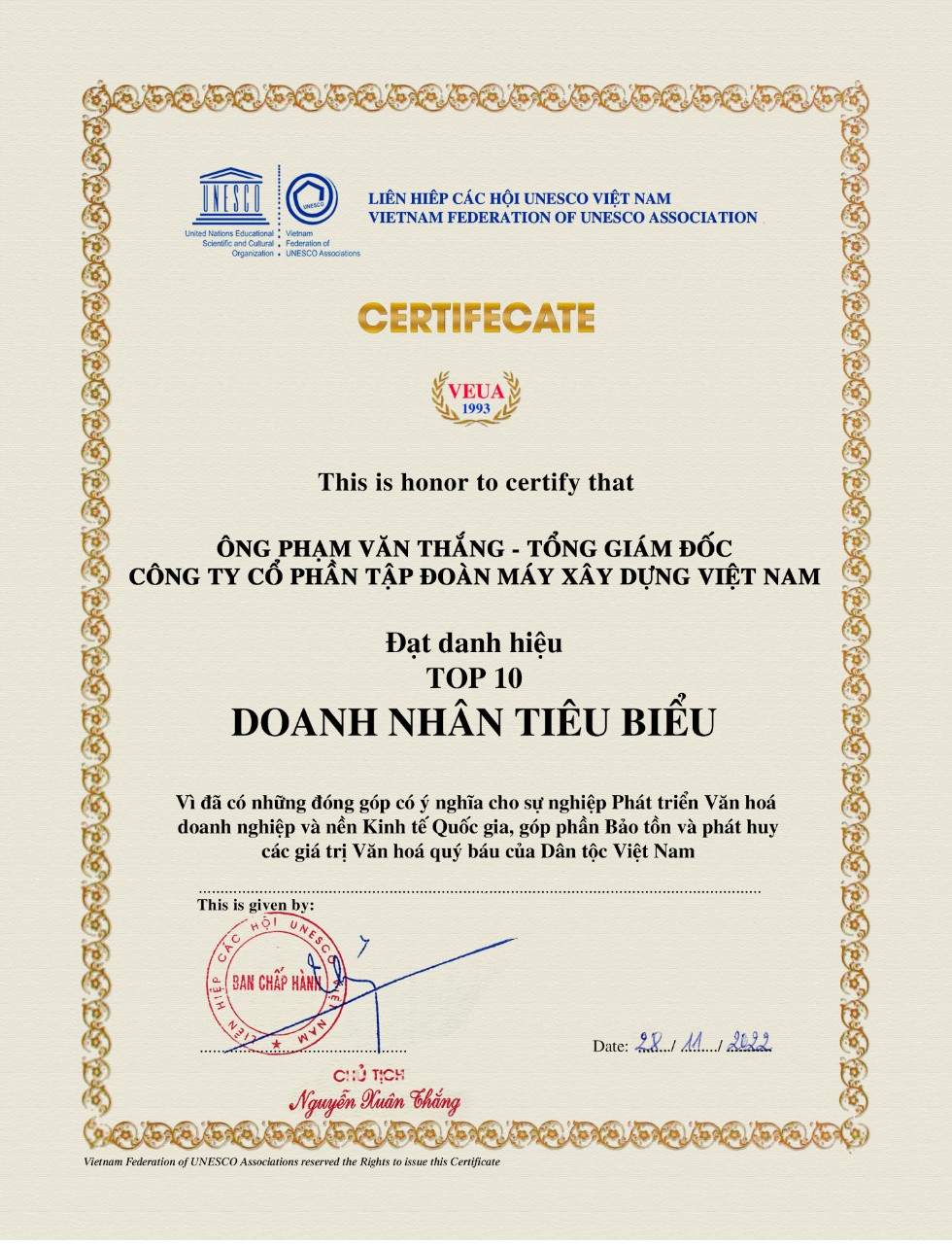 - Ông Phạm Văn Thắng – Chủ tịch HĐQT kiêm Tổng Giám Đốc được sắc phong Tiến sĩ danh dự trong lĩnh vực quản lý doanh nghiệp của hệ thống Đại học Cambridge, Vương Quốc Anh