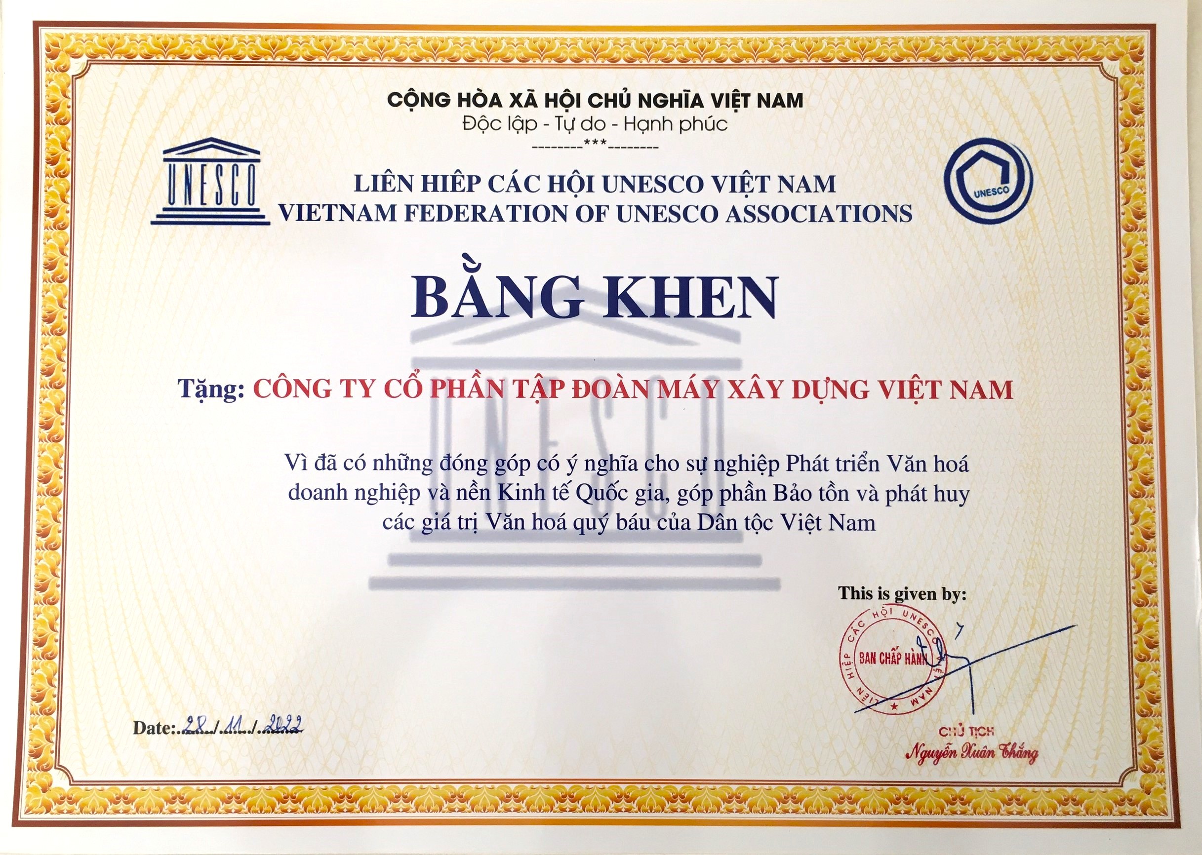 - Bằng khen của Unesco